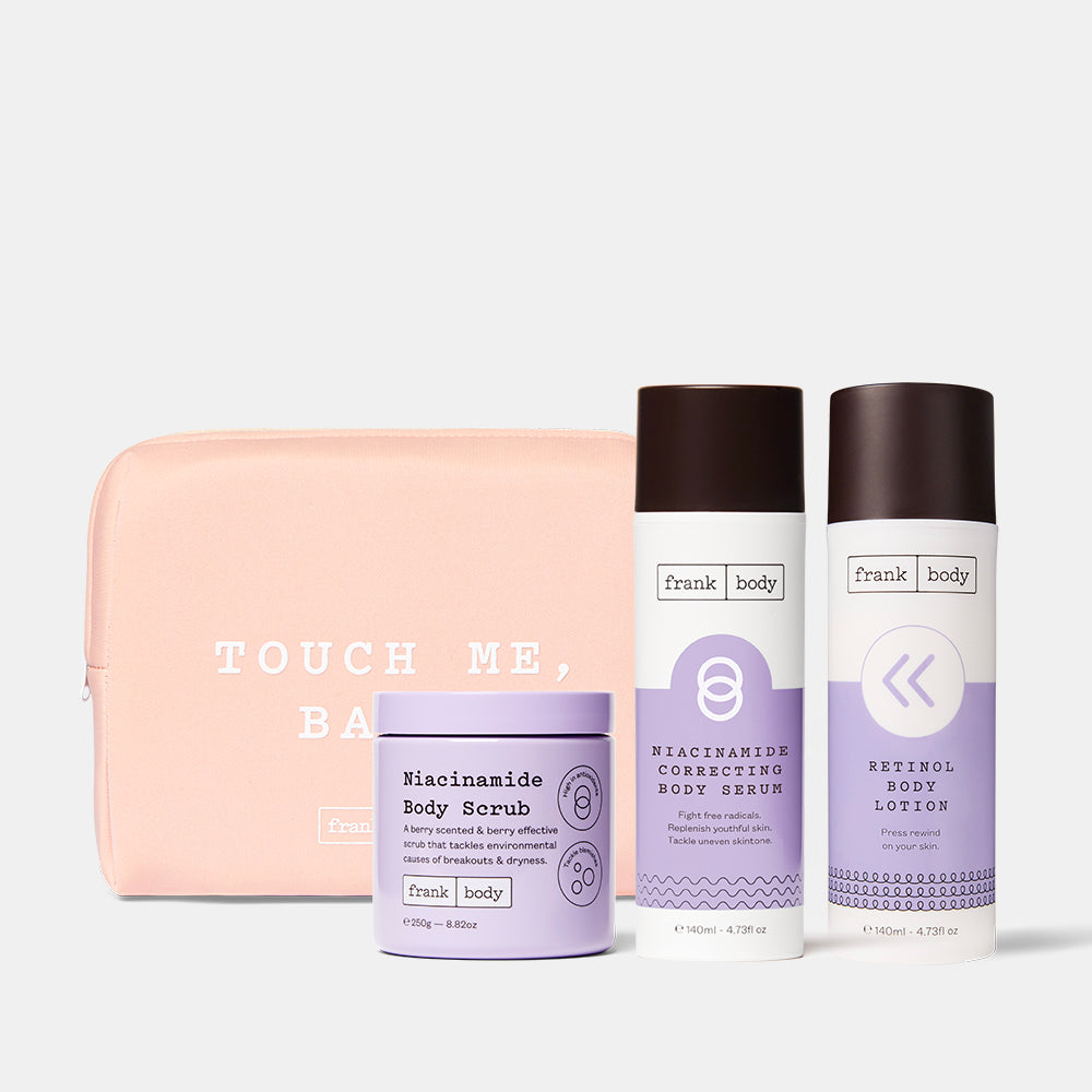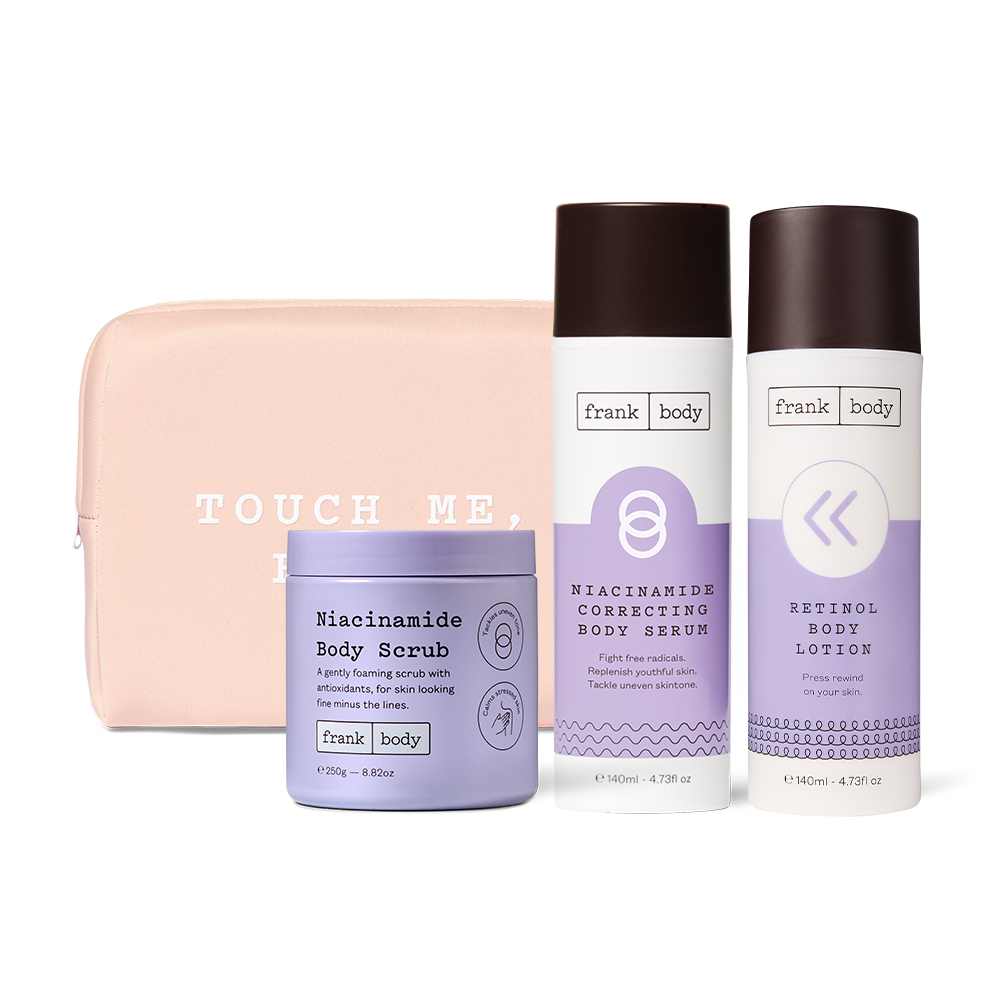 Niacinamide Body Scrub: Glycerin, Sucrose, Magnesium Sulphate, Propanediol, Butyrospermum Parkii (Shea) Butter, Sodium Cocoyl Isethionate, Cetyl Stearyl Alcohol, Niacinamide, Euterpe Oleracea (Acai) Fruit Extract, Lycium Barbarum (Goji Berry) Extract, Vaccinium Myrtillus (Bilberry) Fruit Extract, Camellia Sinensis (Green Tea) Leaf Extract, Coffea Arabica Seed Oil, Aloe Barbadensis (Aloe Vera) Leaf Juice Powder, Water (Aqua), Lauric Acid, Fragrance (Parfum), Potassium Sorbate, Sodium Benzoate, Citric Acid, Hexyl Cinnamal, Limonene, Linalool, CI 60730, CI 17200. Niacinamide Correcting Body Serum: Water (Aqua), Niacinamide, Butyrospermum Parkii (Shea) Butter, Dicaprylyl Carbonate, Myristyl Myristate, Euterpe Oleracea (Acai) Fruit Extract, Lycium Barbarum (Goji Berry) Extract, Vaccinium Myrtillus (Bilberry) Fruit Extract, Camellia Sinensis (Green Tea) Leaf Extract, Centella Asiatica (Gotu Kola) Extract, Coffea Arabica Seed Oil, Aloe Barbadensis (Aloe Vera) Leaf Juice Powder, Tocopherol, Glycerin, Glycine Soja (Soybean) Oil, Polyacrylate Crosspolymer-6, T- Butyl Alcohol, Acrylates/C10-30 Alkyl Acrylate Crosspolymer, Phenoxyethanol, Ethylhexylglycerin, Fragrance (Parfum), Sodium Hydroxide, Sodium Benzoate, Potassium Sorbate, Citric Acid, Citronellol, Geraniol, Hexyl Cinnamal, Limonene, Linalool, CI 60730, CI 17200. Retinol Body Lotion: Water (Aqua), Helianthus Annuus Seed Oil, Caprylic/Capric Triglyceride, Caprylyl Caprylate/Caprate, Cetearyl Alcohol, Glyceryl Stearate, Cetearyl Glucoside, Glycerin, Myristyl Myristate, Retinol, Acetyl Heptapeptide-4, Niacinamide, Vaccinium Myrtillus Fruit Extract, Lycium Barbarum Fruit Extract, Euterpe Oleracea Fruit Extract, Butyrospermum Parkii Butter, Mangifera Indica Seed Butter, Macadamia Ternifolia Seed Oil, Rosa Canina Fruit Oil, Tocopherol, Glycine Soja Oil, Sodium Stearoyl Glutamate, Sodium Polyacrylate, Undecane, Tridecane, Sodium Benzoate, Potassium Sorbate, Phenoxyethanol, Ethylhexylglycerin, Caprylyl Glycol, Fragrance (Parfum), Citric Acid.