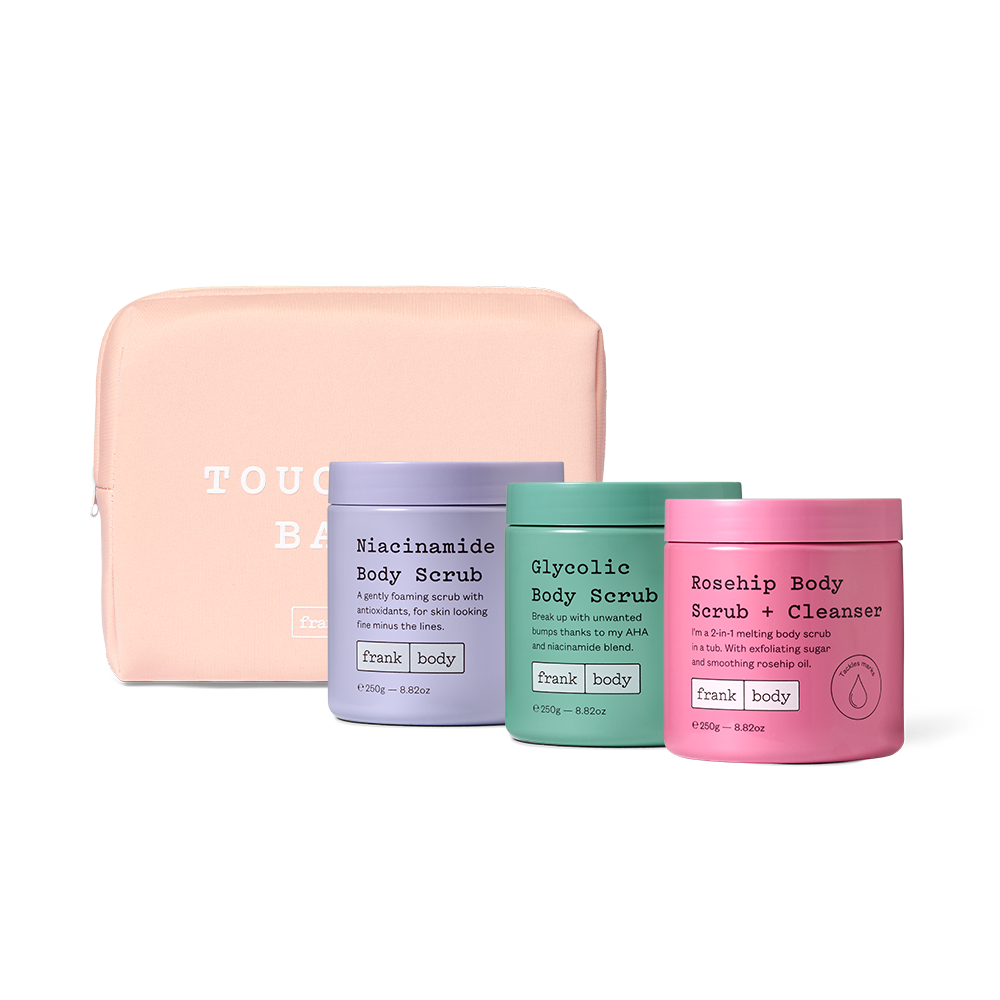 Glycolic Body Scrub: Water (Aqua), Pumice, Glycolic Acid, Palmitic Acid, Cetyl Stearyl Alcohol, Stearic Acid, Sodium Hydroxide, Lactic Acid, Glycerin, Cetearyl Olivate, Sorbitan Olivate, Xanthan Gum, Cocos Nucifera (Coconut) Oil, Melaleuca Alternifolia (Tea Tree) Leaf Oil, Tocopherol, Glycine Soja (Soybean) Oil, Sodium Hyaluronate, Hamamelis Virginiana (Witch Hazel) Leaf Extract, Niacinamide, Aleurites Moluccanus (Kukui) Seed Oil, Eucalyptus Globulus Leaf Oil, Macadamia Ternifolia Seed Oil, Leuconostoc/Radish Root Ferment Filtrate, Aloe Barbadensis (Aloe Vera) Leaf Juice Powder, Althaea Officinalis (Marshmallow) Root Extract, Lycium Barbarum (Goji Berry) Fruit Extract, Charcoal Powder, Vitis Vinifera (Grape) Seed Oil, Theobroma (Cacao) Seed Extract, Quartz, Lauric Acid, Myristic Acid, Arachidic Acid, Benzyl Alcohol, Phenoxyethanol, Alcohol, Fragrance (Parfum), Limonene. Niacinamide Body Scrub: Glycerin, Sucrose, Magnesium Sulphate, Propanediol, Butyrospermum Parkii (Shea) Butter, Sodium Cocoyl Isethionate, Cetyl Stearyl Alcohol, Niacinamide, Euterpe Oleracea (Acai) Fruit Extract, Lycium Barbarum (Goji Berry) Extract, Vaccinium Myrtillus (Bilberry) Fruit Extract, Camellia Sinensis (Green Tea) Leaf Extract, Coffea Arabica Seed Oil, Aloe Barbadensis (Aloe Vera) Leaf Juice Powder, Water (Aqua), Lauric Acid, Fragrance (Parfum), Potassium Sorbate, Sodium Benzoate, Citric Acid, Hexyl Cinnamal, Limonene, Linalool, CI 60730, CI 17200. Rosehip Body Scrub & Cleanser: Glycerin, Sucrose, Sodium Cocoyl Isethionate, Water, Lauric Acid, Butyrospermum Parkii (Shea) Butter, Cocos Nucifera (Coconut) Oil, Helianthus Annuus (Sunflower) Seed Oil, Simmondsia Chinensis (Jojoba) Seed Oil, Rosa Canina (Rosehips) Fruit Oil, Tocopherol, Glycine Soja (Soybean) Oil, Aloe Barbadensis Leaf Juice, Coffea Arabica (Coffee) Seed Extract, Lycium Barbarum (Goji Berry) Fruit Extract, Rosmarinus Officinalis (Rosemary) Leaf Extract, Oenothera Biennis (Evening Primrose) Oil, Limnanthes Alba (Meadowfoam) Seed Oil, Lavandula Angustifolia (Lavender) Oil, Pelargonium Graveolens Flower Oil, Fragrance, Sodium Methyl Cocoyl Taurate, Sodium Benzoate, Iron Oxide (CI 77491), Ultramarines (CI 77007).